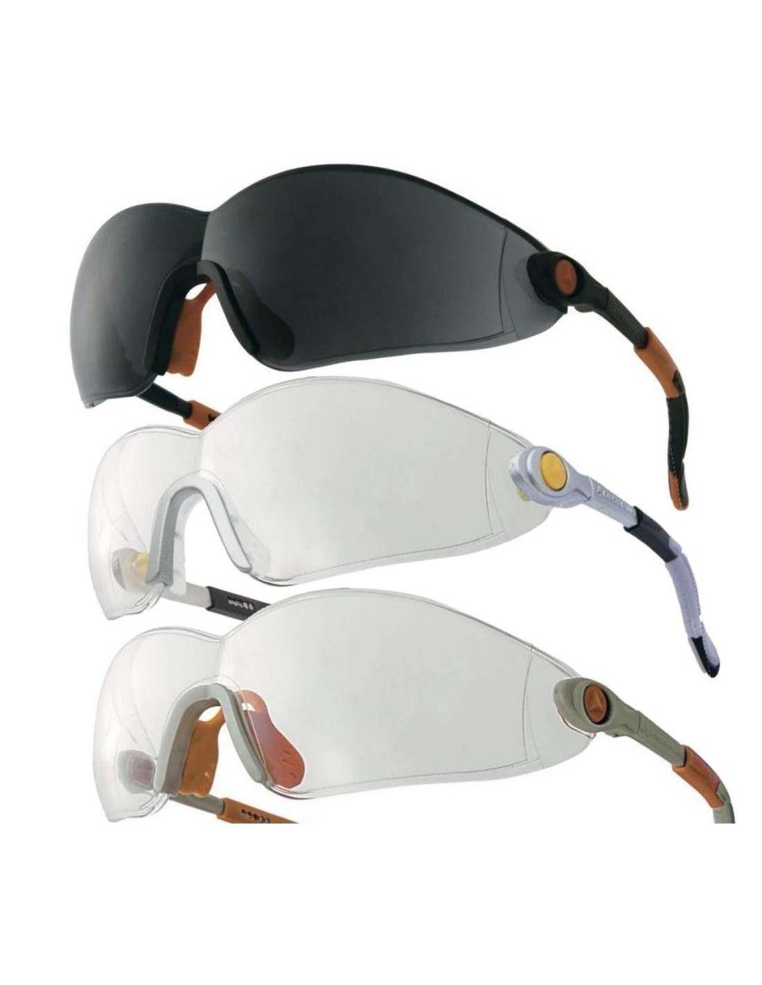 Lunettes polycarbonate monobloc. Branches nylon inclinables et ajustables. Embouts spatulés. Pont nasal TPE souple extra confort. Protections latérales. AM - AS - UV400