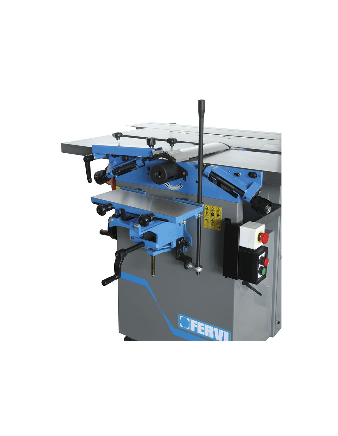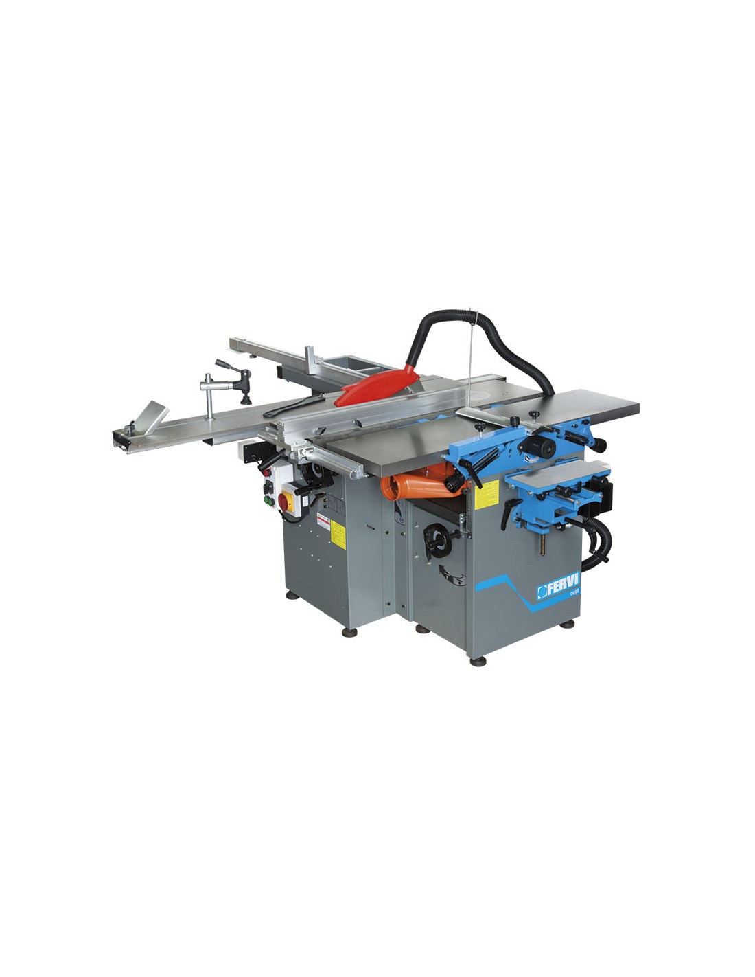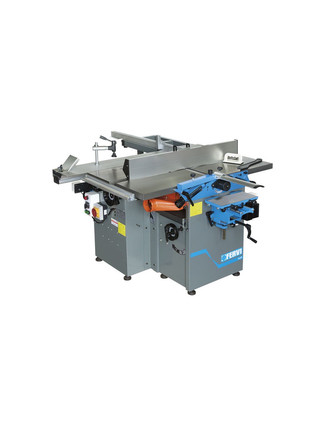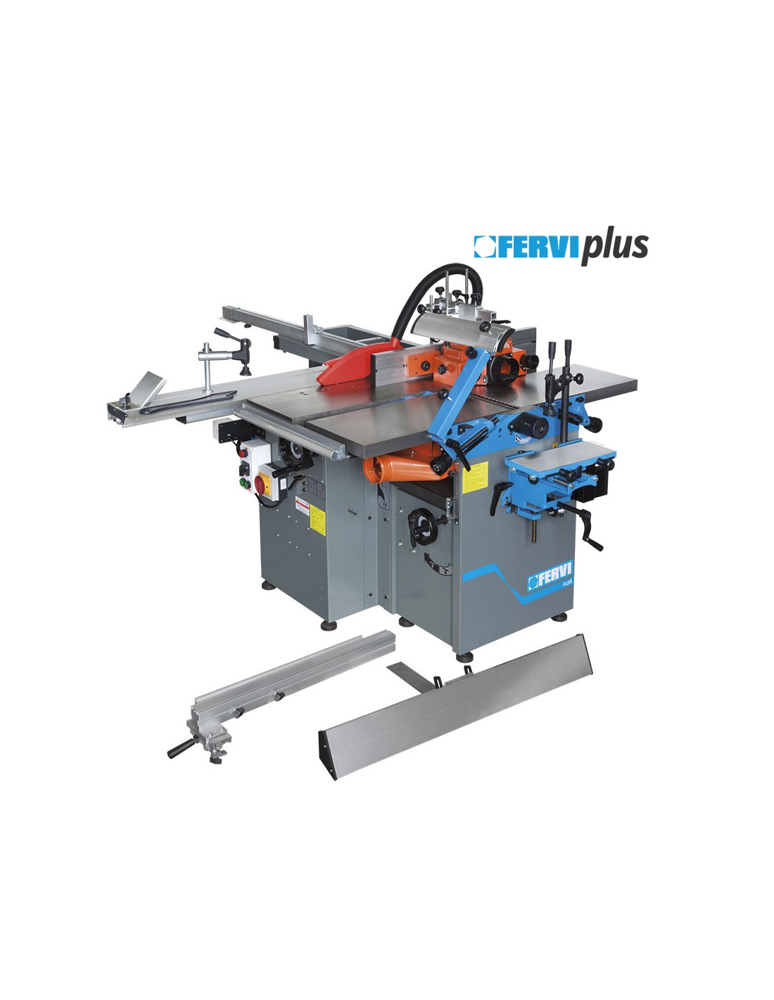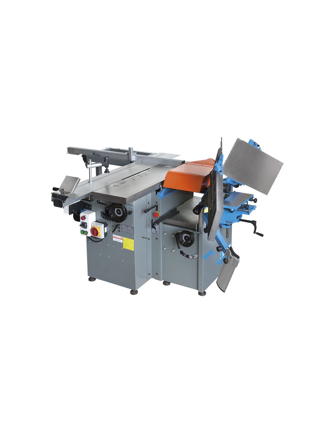 Scie à table, chariot coulissant, lame inciseur, toupie, raboteuse de surface, raboteuse d'épaisseur, unité de mortaisage et tambour de ponçage à 1500 tr/min.