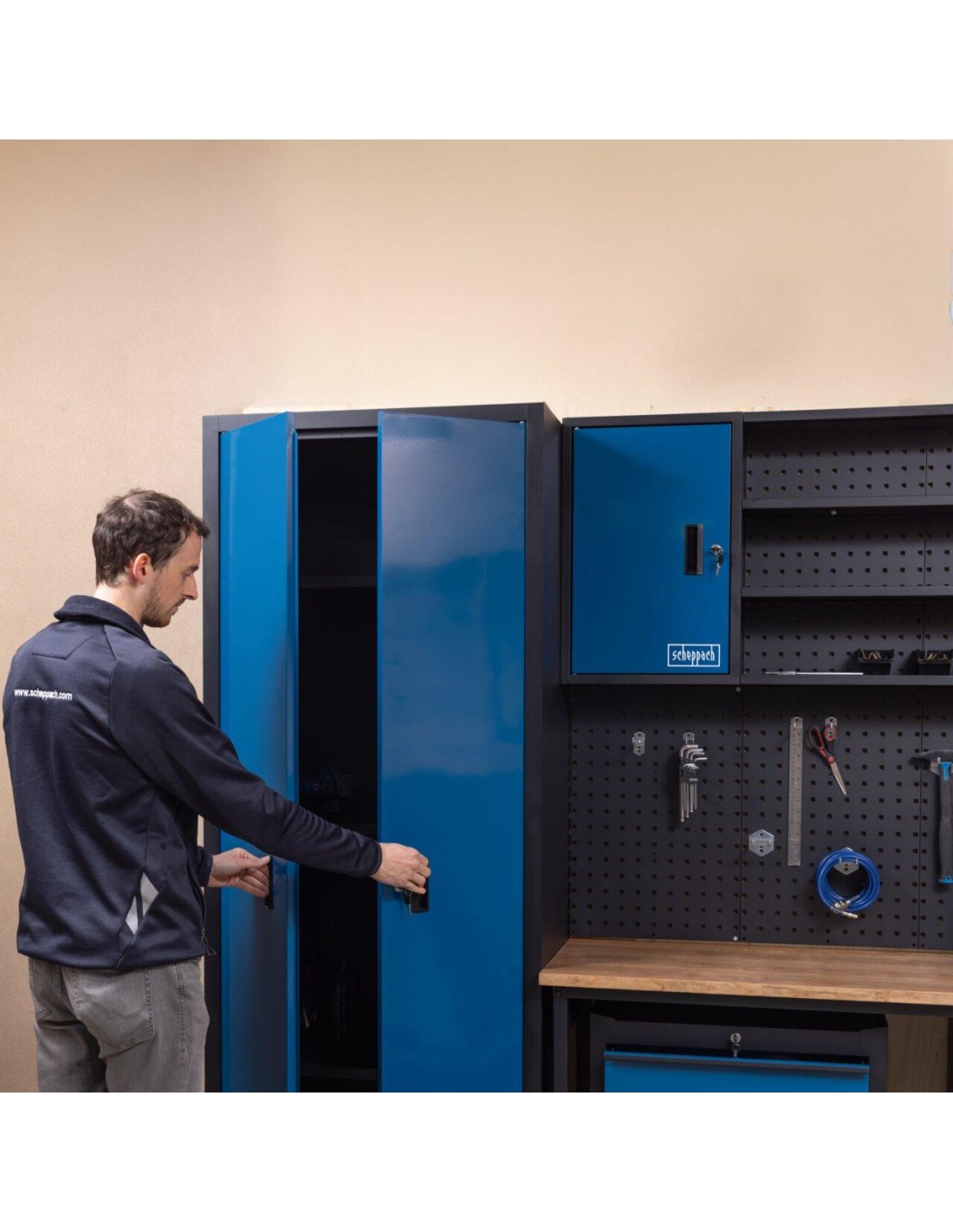 Fabriqué en acier robuste avec revêtement en poudre, ce système modulaire est conçu pour durer et résister à l’usure quotidienne. Les armoires, équipées de portes verrouillables, garantissent un stockage sûr des outils et du matériel. La garde-robe principale est équipé d'étagères réglables en hauteur, chacune d'une capacité capacité de charge jusqu'à 30 kg et pieds réglables pour plus de stabilité optimale. Les armoires suspendues offrent un espace de rangement supplémentaire et comprennent une paroi perforée avec des trous standards (10 x 10 mm, espacement des trous de 38 mm) pour suspendre des outils avec les crochets fournis.