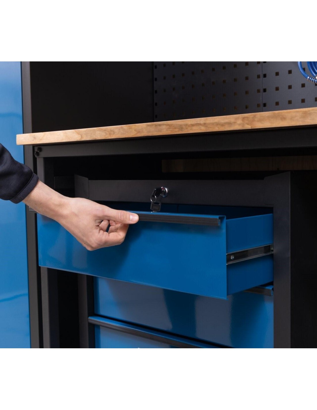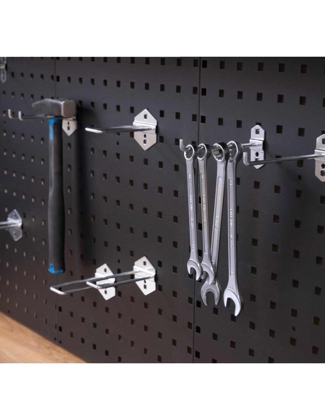 - Paroi perforée avec trous standards et crochets inclus pour une organisation optimale des outils.