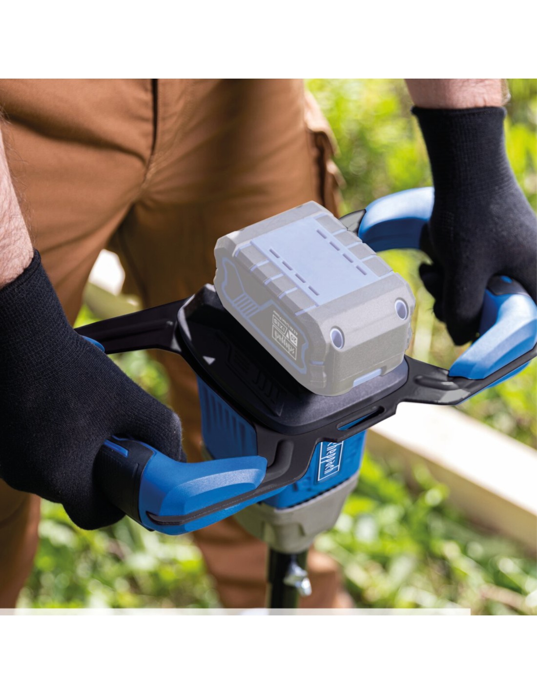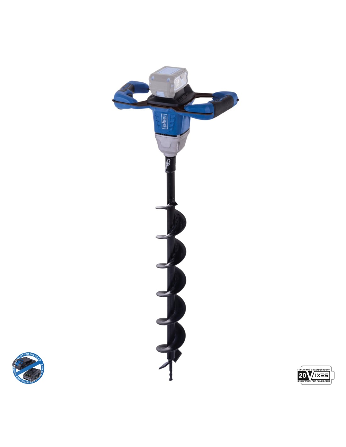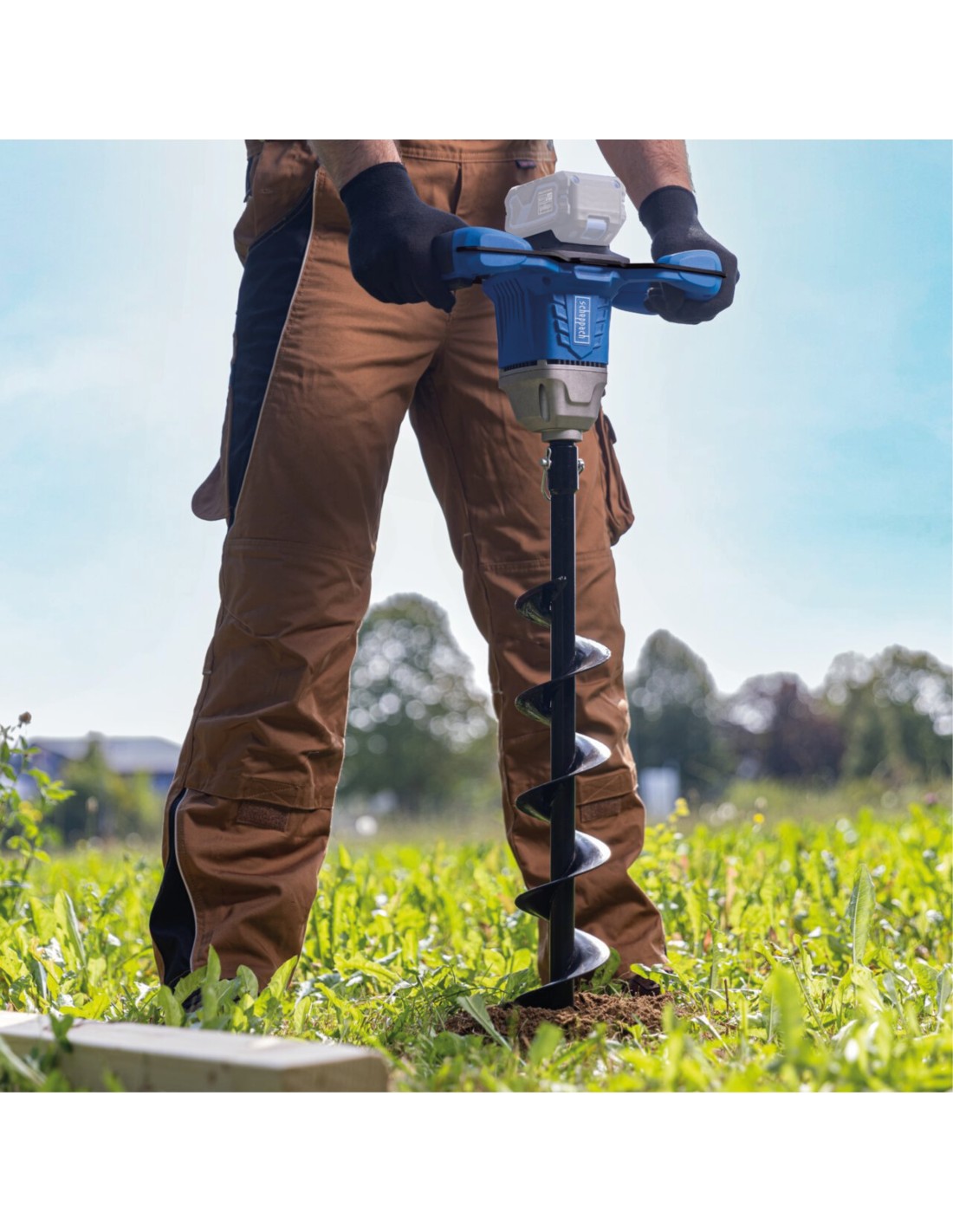 SEMIS À BATTERIE - Semoir puissant, 125 tr/min, pour percer des poteaux de clôture, des fondations ou des trous de plantation - Moteur sans balais sans entretien, particulièrement efficace, avec une autonomie et une durabilité accrues et une faible usure - Fonctionnement sans fil avec la série Scheppach IXES 20 Volts - toutes les batteries et chargeurs de cette série de systèmes peuvent être combinés avec la vis sans fil - Vis sans fil à changement rapide et sans outil - Diamètre de la vis de 100 mm, longueur de 800 mm - 3 modes de fonctionnement - Eco, Mode puissance, fonctionnement dans le sens inverse des aiguilles d'une montre - Double poignée avec poignée souple permettant un travail ergonomique et de nombreuses utilisations - Batterie et chargeur disponibles séparément
