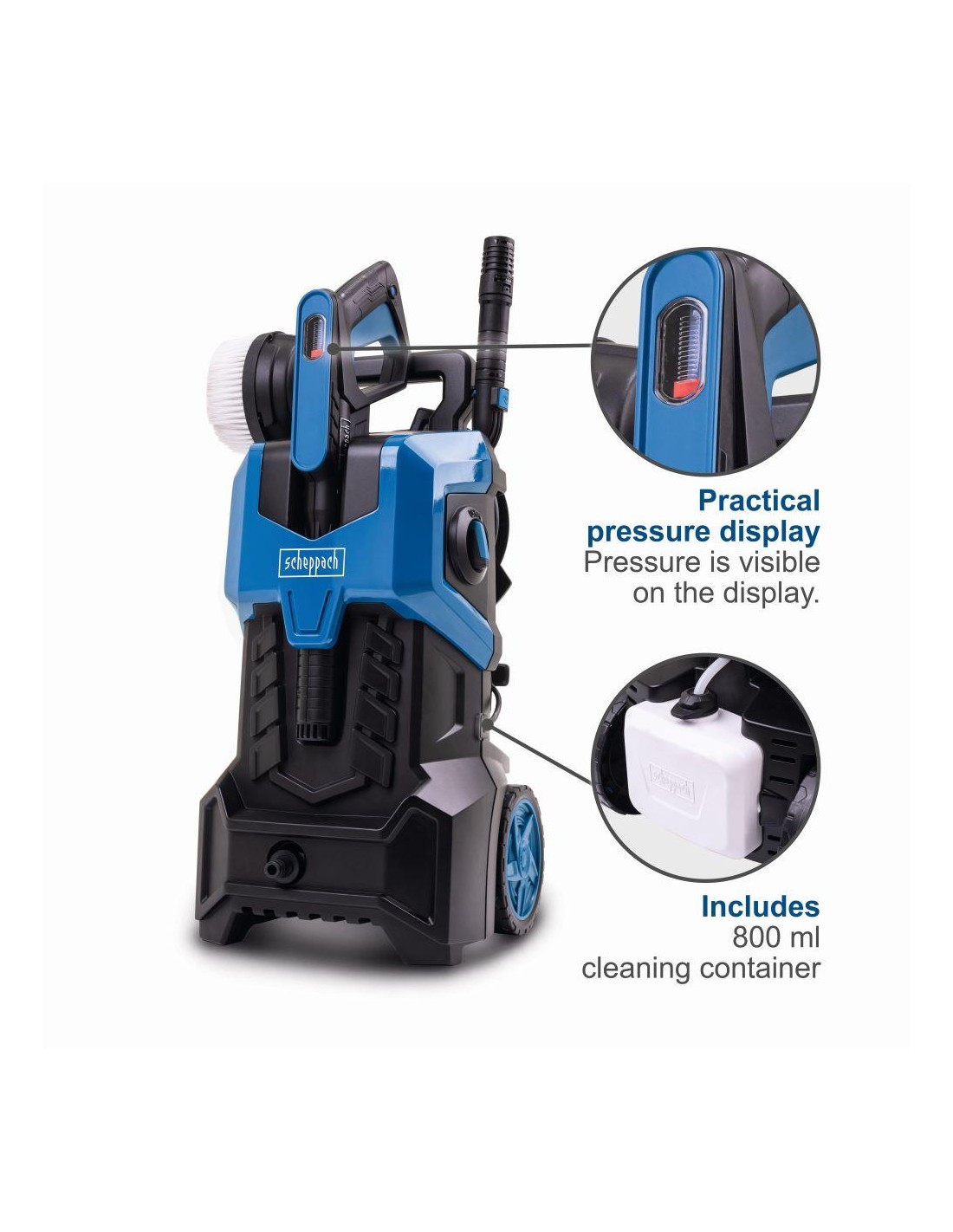 Le jet haute pression peut être réglé de manière variable via la buse haute pression multifonctionnelle ; la pression de service peut être lue sur la poignée pistolet.
