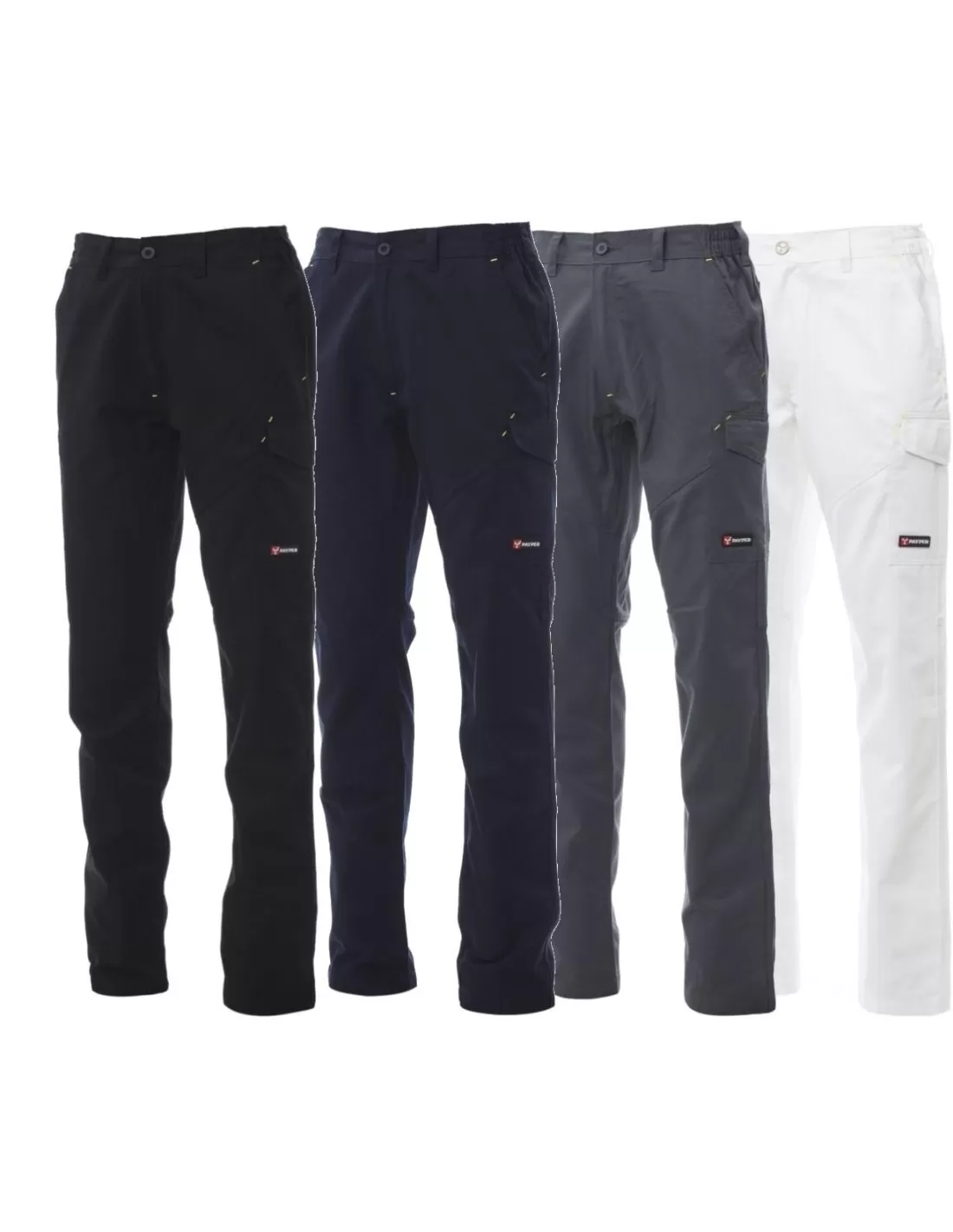 Pantalon unisexe, toute saison, élastiques latéraux et passants à la taille, fermeture éclair et bouton en plastique, deux poches de coupe classique sur le devant, une poche latérale LOCK SYSTEM, un porte-mètre, deux poches arrière, une ouverte et une avec rabat et velcro, inserts et surpiqûres teinte assortie, bandes réfléchissantes sur poche arrière, triples coutures.
