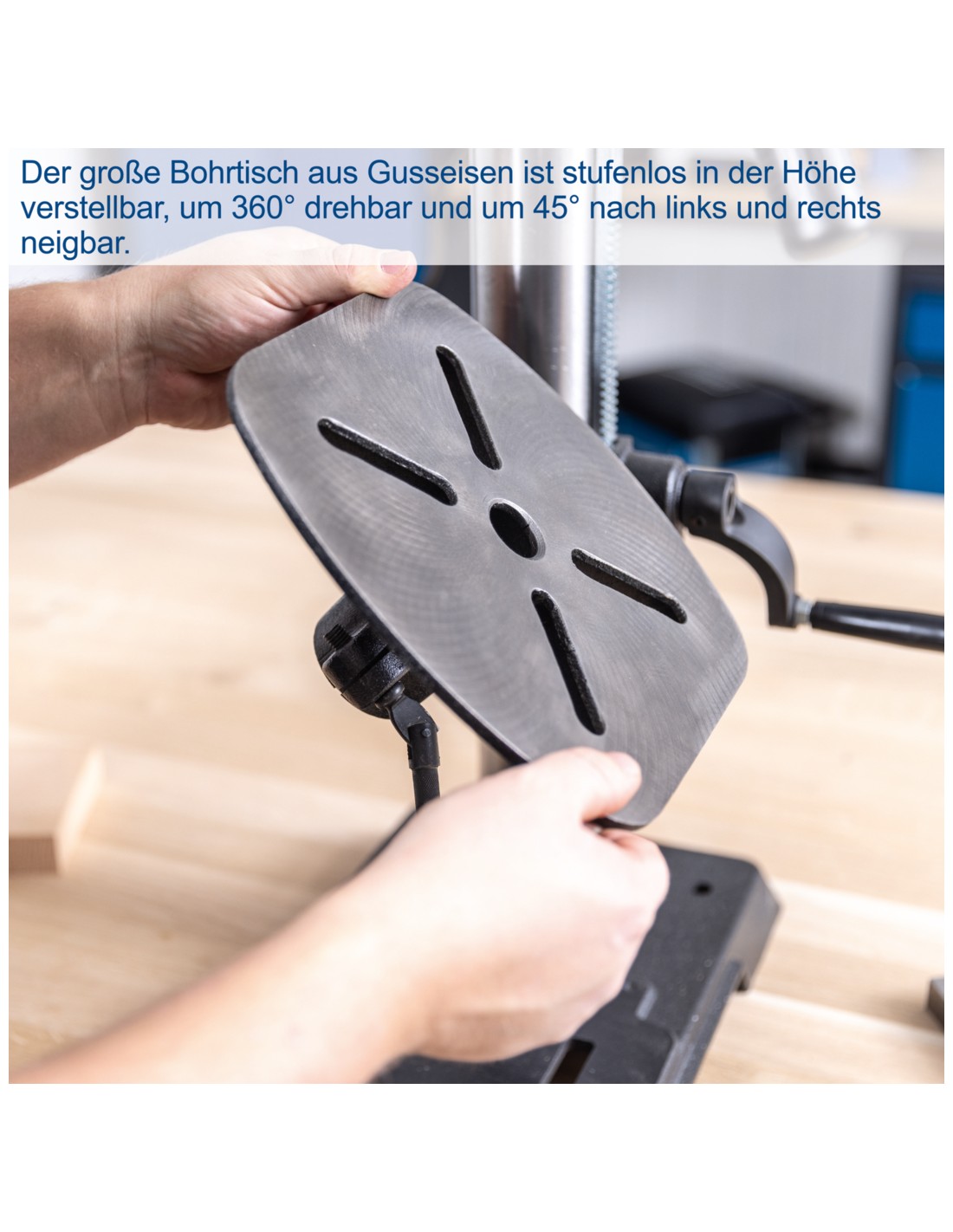 • Grande table de perçage en fonte de 240 x 240 mm, rotative à 360°, réglable en hauteur en continu et inclinable de +/- 45°
