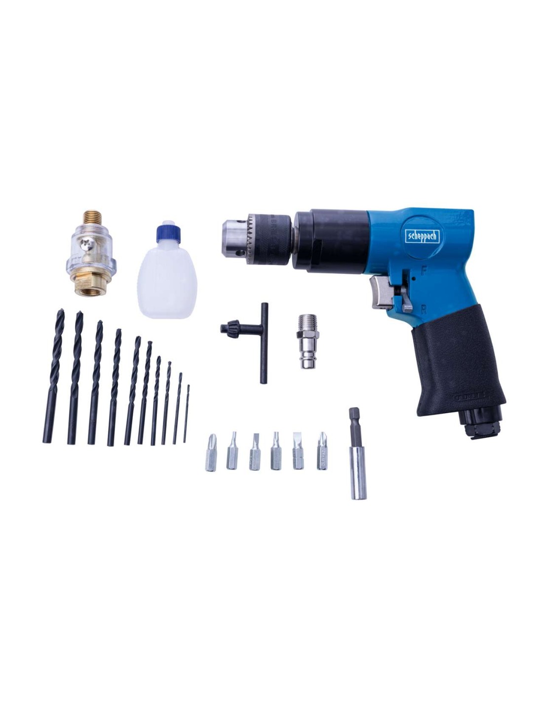 Perceuse pneumatique Scheppach avec jeu d'accessoires, une aide pratique dans votre atelier, légère et compacte.