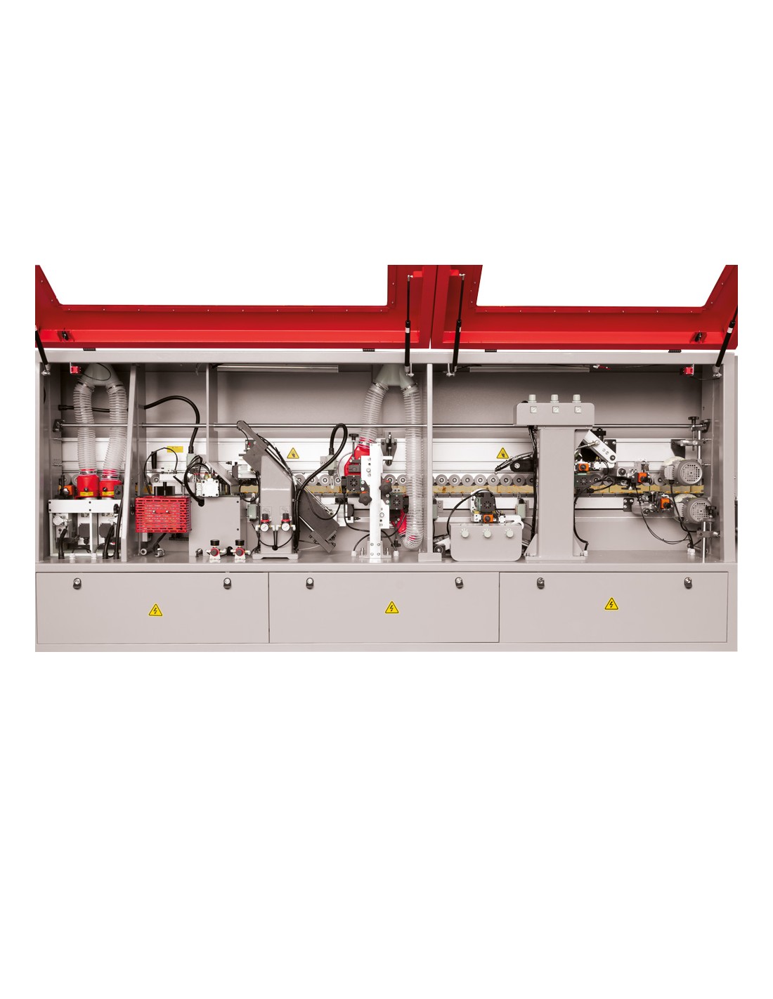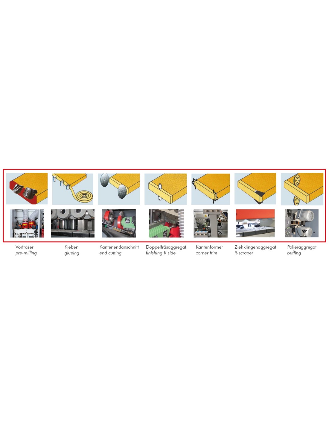 Découpe des bords (double fraise), une pour l'angle inférieur et une pour l'angle supérieur de la pièce (moteur de 0,3 kW par unité). Unité de raclage avec rayon (supérieur/inférieur).