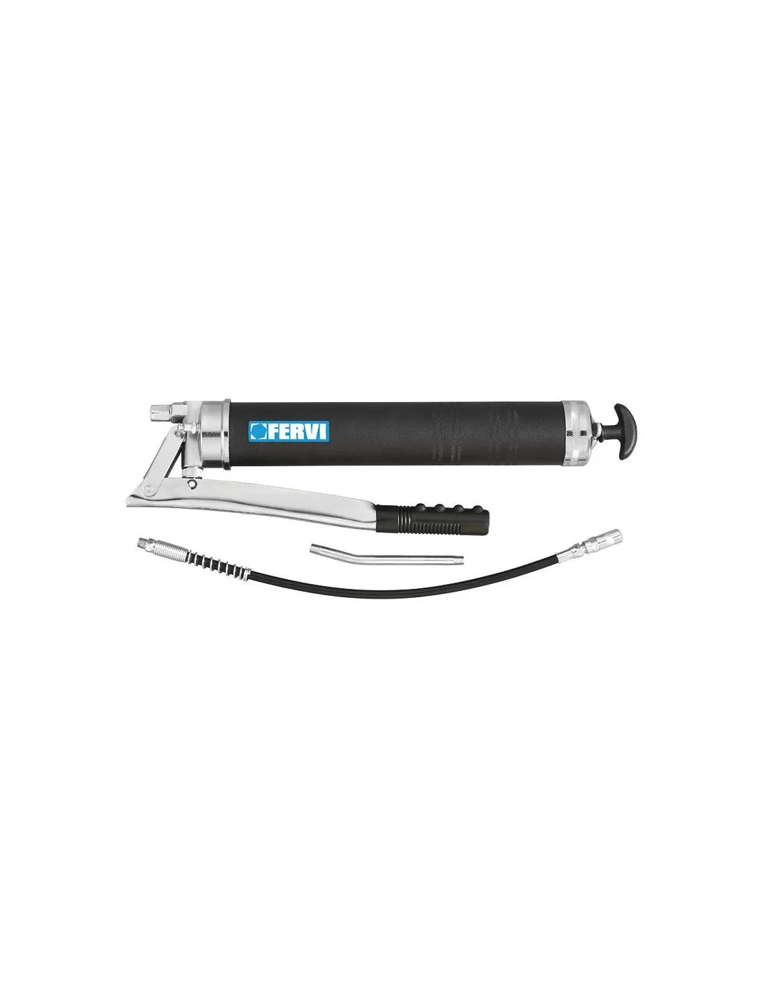 Composé d'un réservoir et d'une pompe en métal, d'un raccord et d'un tuyau flexible en PVC de 450 mm permettant l'utilisation de cartouches de graisse de diamètre 55 mm ou de graisse en vrac (adaptateur déjà monté).
