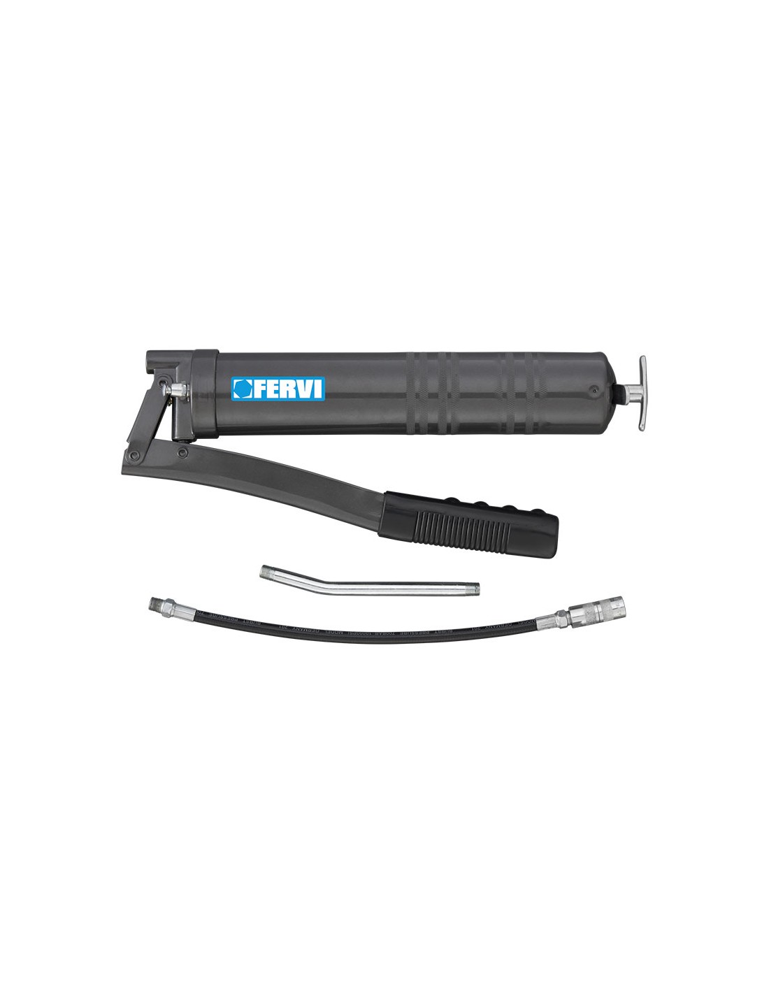 Composé d'un réservoir et d'une pompe en métal, d'un raccord et d'un tuyau flexible en PVC de 300 mm, pour une utilisation avec de la graisse en vrac ou des cartouches de graisse de diamètre 53 mm.