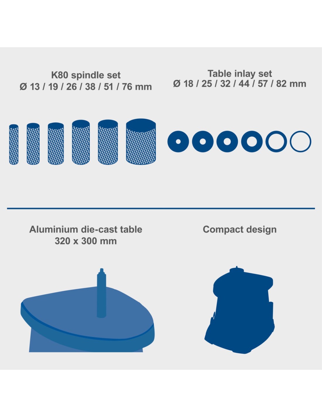 RECTIFIEUSE À BROCHE OSCILLANTE • Compacte et légère pour un transport facile • Moteur puissant de 450 W avec une puissance suffisante pour tous les matériaux en bois • Broche rotative et oscillante pour des surfaces de meulage lisses et un travail de détail précis • Grande table solide en aluminium moulé sous pression pour une précision et une stabilité maximales, même lors du traitement de pièces plus grandes • Buse d'aspiration de poussière intégrée pour le raccordement à un système d'aspiration garantit un travail en toute sécurité • Comprend 6 manchons de ponçage de diamètres 13, 19, 26, 38, 51 et 76 mm, rouleaux en caoutchouc assortis et 6 inserts de table • Possibilité de ranger les accessoires et outils de montage sur le côté • Interrupteur marche/arrêt facile d'accès et étanche à la poussière