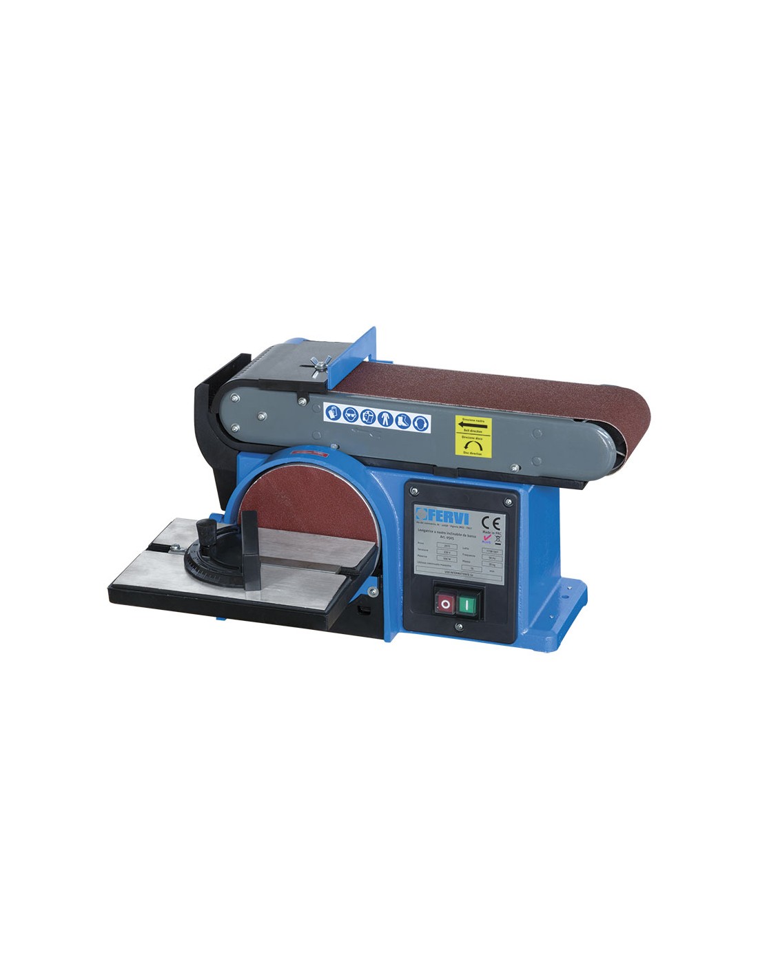 Utilisable avec bande abrasive horizontalement ou verticalement. Avec porte-pièce, bande abrasive et disque. Table de travail inclinable en fonte d'aluminium. Rouleau traîné en aluminium sur roulements. A utiliser exclusivement pour le travail du bois et des matières plastiques.