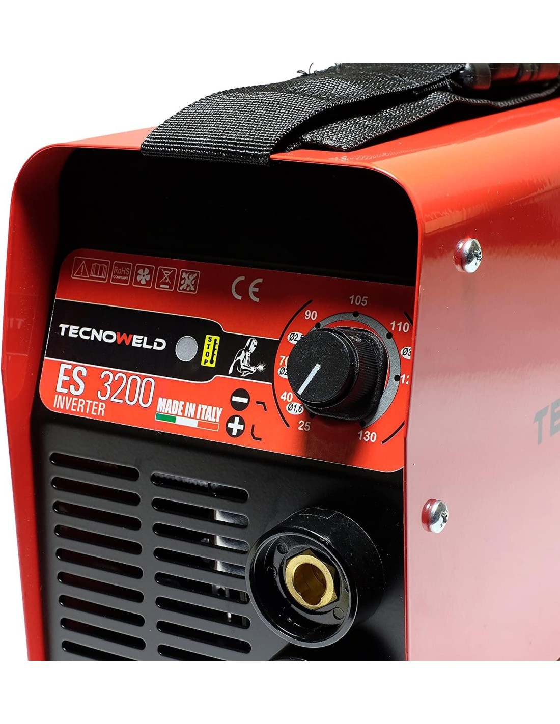 Poste à souder inverter de 130 ampères, connectable au générateur de courant, résiste à un range de tension d'entrée de 170 à 250 V, fourni dans un mallette en plastique avec accessoires inclus (pince de terre et câble de sortie, porte-électrode et câble de sortie, masque de protection , brosse marteau) Soude les électrodes Rutile jusqu'au diam 3,25.