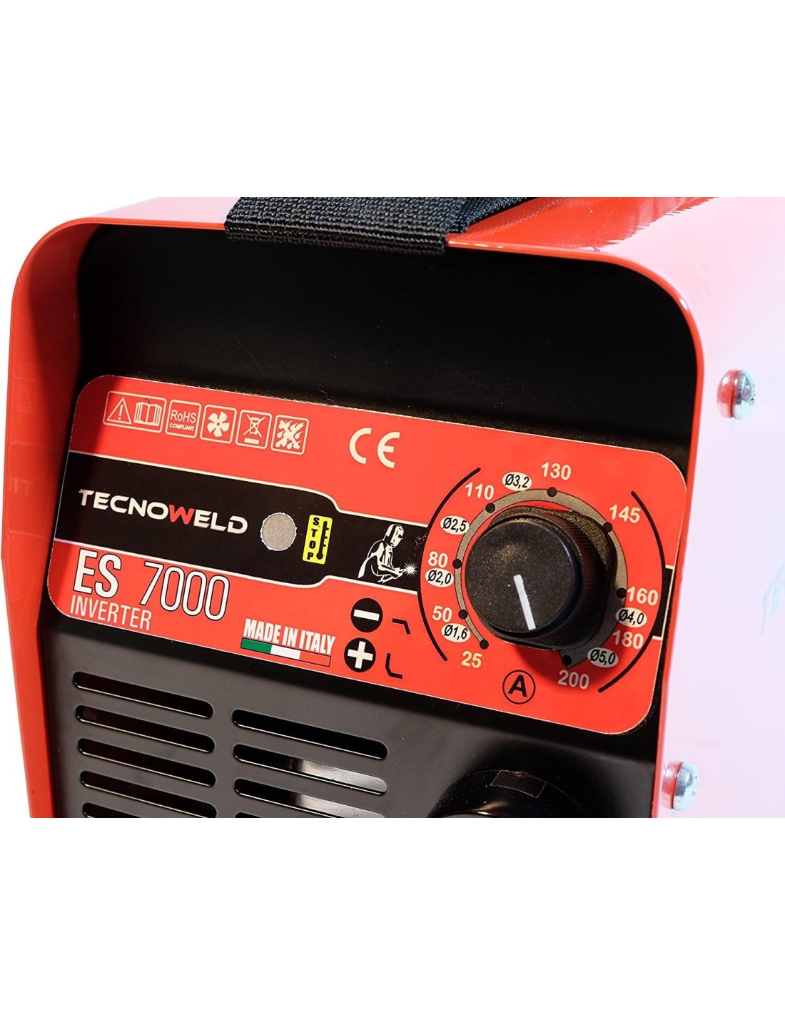 Poste à souder inverter de 200 ampères, connectable au générateur de courant, résiste à un range de tension d'entrée de 170 à 250 V, fourni dans un mallette en plastique avec accessoires inclus (pince de terre et câble de sortie, porte-électrode et câble de sortie, masque de protection , brosse marteau) Soude les électrodes Rutile jusqu'au diam 4.