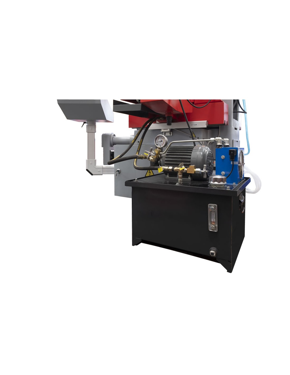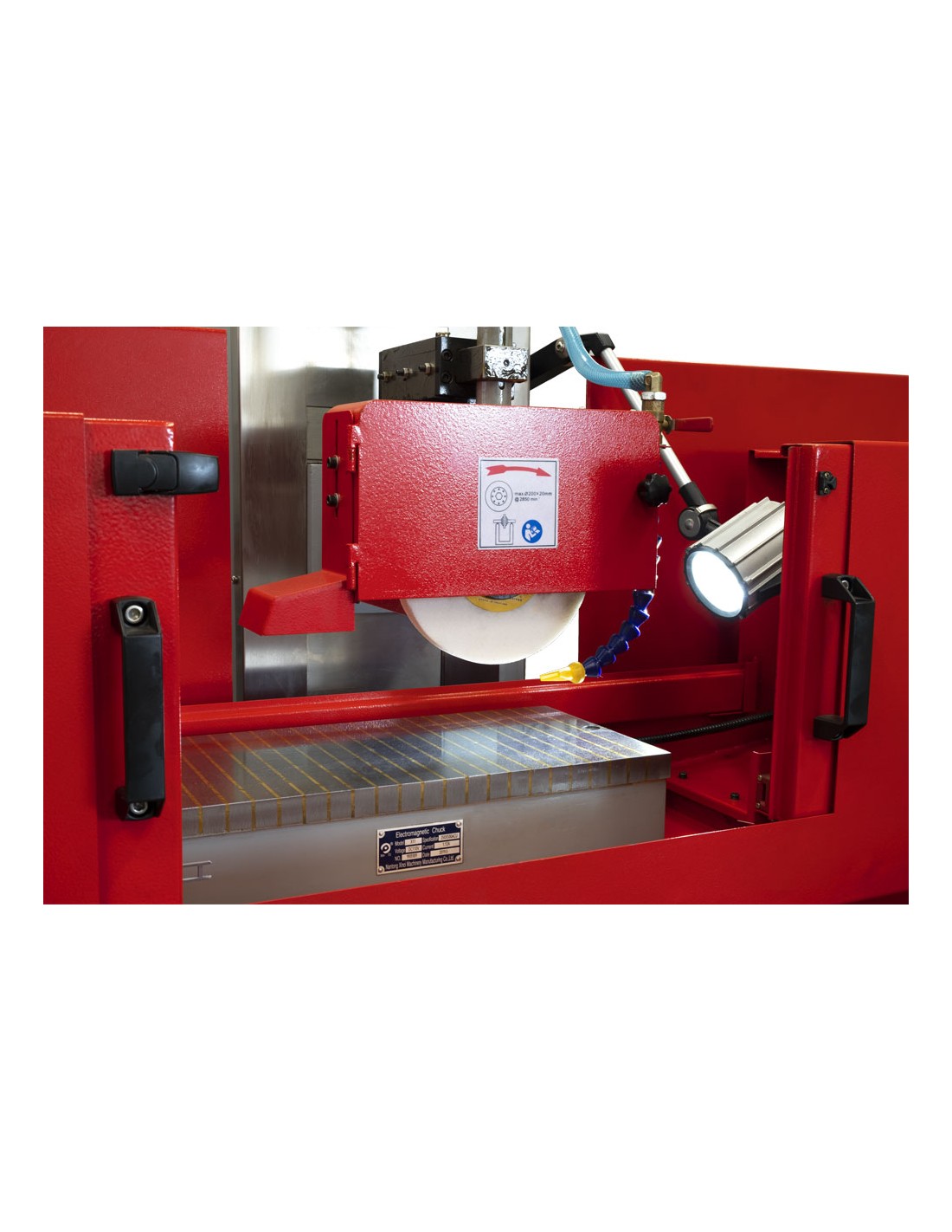 Équipement : Meule (200 x 20 mm, corindon blanc 46), pompe + réservoir de liquide de refroidissement, aides à l'équilibrage de la meule (arbre, support), outils, affichage numérique à 2 axes ; Projecteur de travail à LED, groupe hydraulique avec pompe, moteur et radiateur