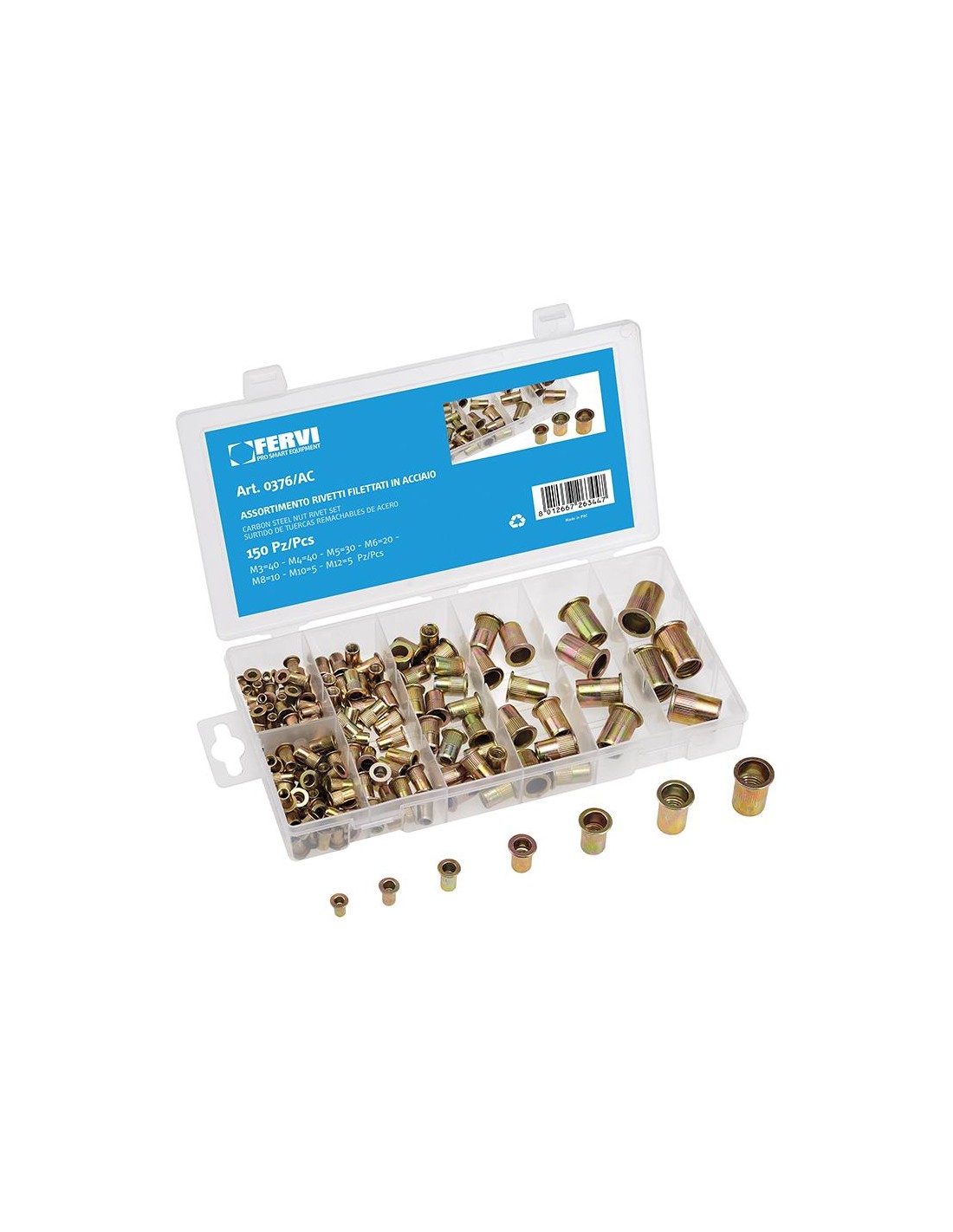 Zingué jaune, M3 : 40 pièces - M4 : 40 pièces - M5 : 30 pièces - M6 : 20 pièces - M8 : 10 pièces - M10 : 5 pièces - M12 : 5 pièces.