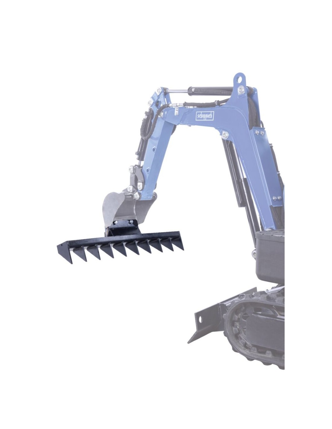 Râteau robuste pour mini pelle Scheppach EXC815. Parfait pour ratisser la paille ou les mauvaises herbes, séparer les pierres, niveler et ameublir le sol. Facile à fixer au seau existant.