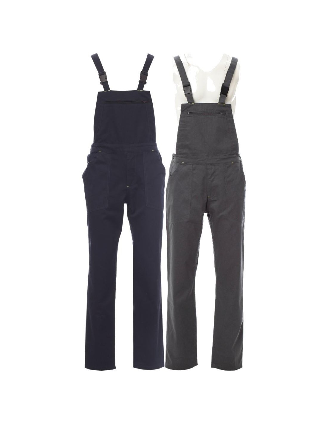 Salopette avec ample protection au niveau des reins, bretelles élastiques et boucles avec fermeture automatique, ouverture latérale avec boutons, fermeture de la patte avec zip, élastique à la taille . Grande poche poitrine double dont une avec zip, deux poches porte-mètre sur le côté.