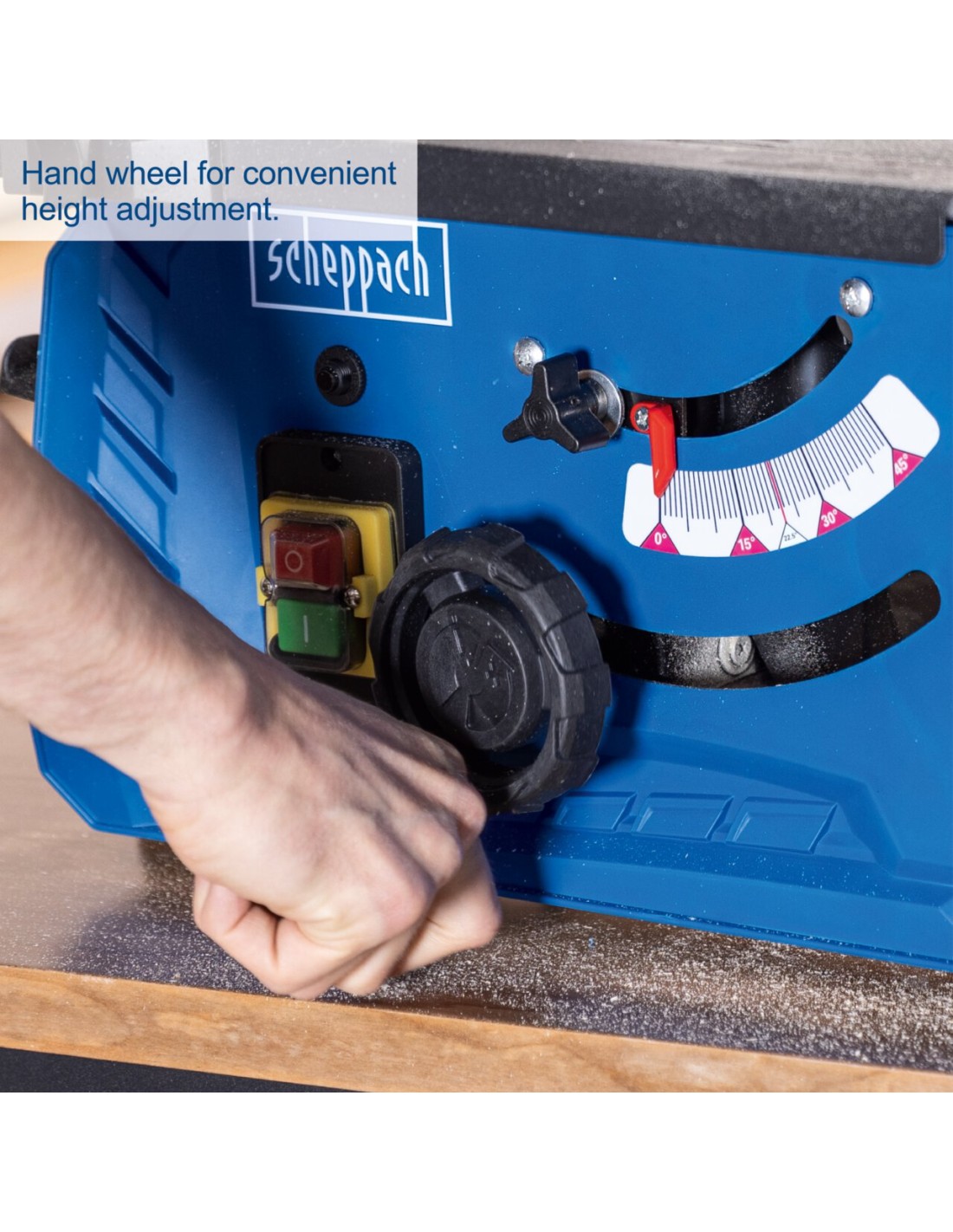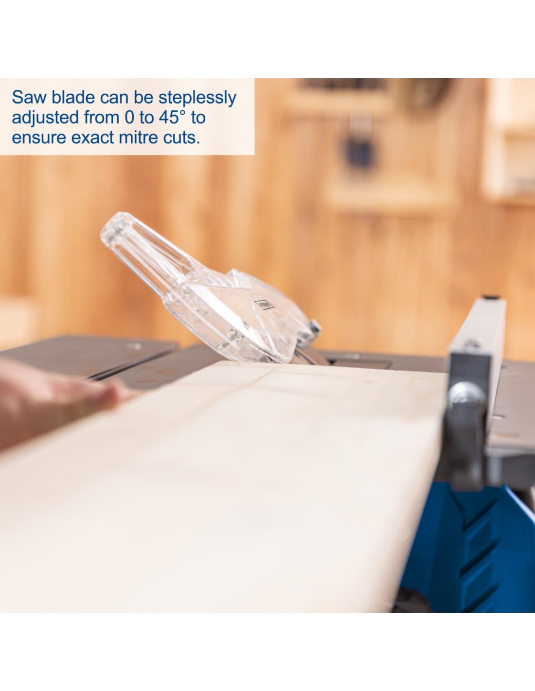 SCIE CIRCULAIRE D'ÉTABLI 210 MM • Scie circulaire compacte pour une coupe précise des poutres, des profilés en bois ainsi que des coupes longitudinales et d'onglet • Moteur puissant de 1 500 W avec interrupteur de surcharge automatique • Volant pour un confort de hauteur de coupe optimal • Connexion intégrée pour extraction externe • Lame inclinable en continu de 0 à 45° pour des coupes angulaires précises • Hauteur de coupe à max. 90° 70 mm / max. 45° 54 mm - Conception compacte - idéal pour une utilisation mobile - Guide d'angle réglable de -60° à +60°, idéal pour les coupes obliques - Guide parallèle double pince avec règle graduée pour des coupes longitudinales particulièrement précises - Lame Ø 210 mm avec 4800 min-1 pour des résultats de coupe précis - Sécurité de travail maximale grâce à la protection de la lame - Fourni avec un guide d'angle, un guide parallèle et un poussoir