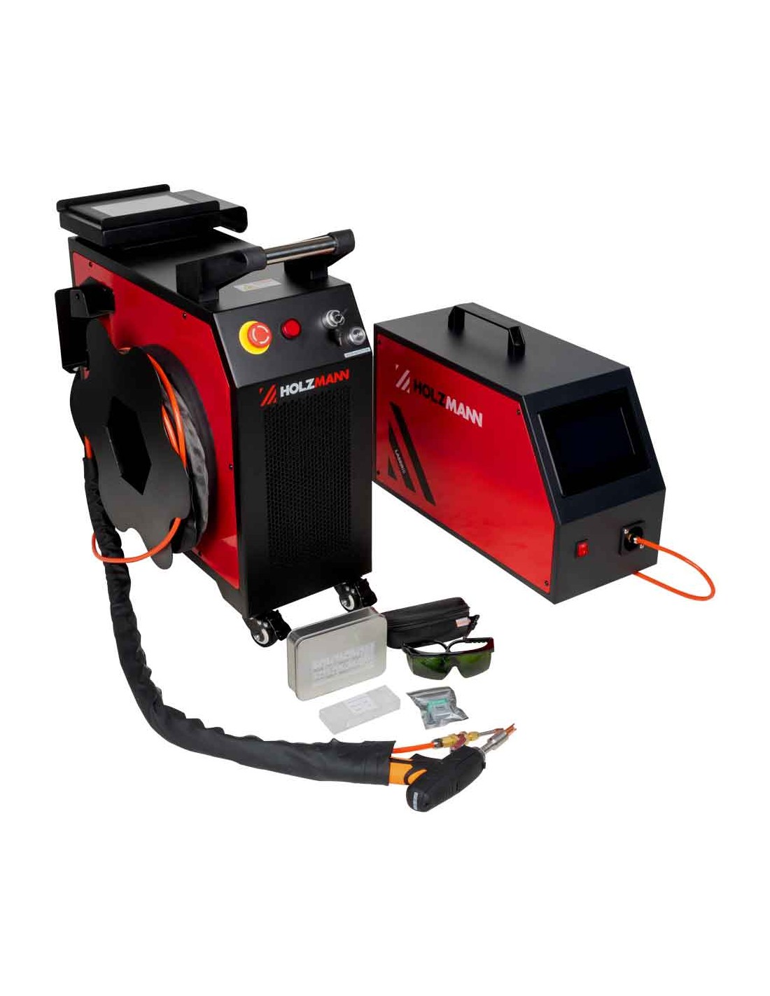 Système de soudage HOLZMANN LASER15_230 V. 1,5 kW, multifonction, refroidi par air. Soudage, dérouillage et découpe, tout-en-un. Technologie de pointe. Comprend un dévidoir, un écran pour une utilisation facile et un jeu de buses/lentilles de rechange.