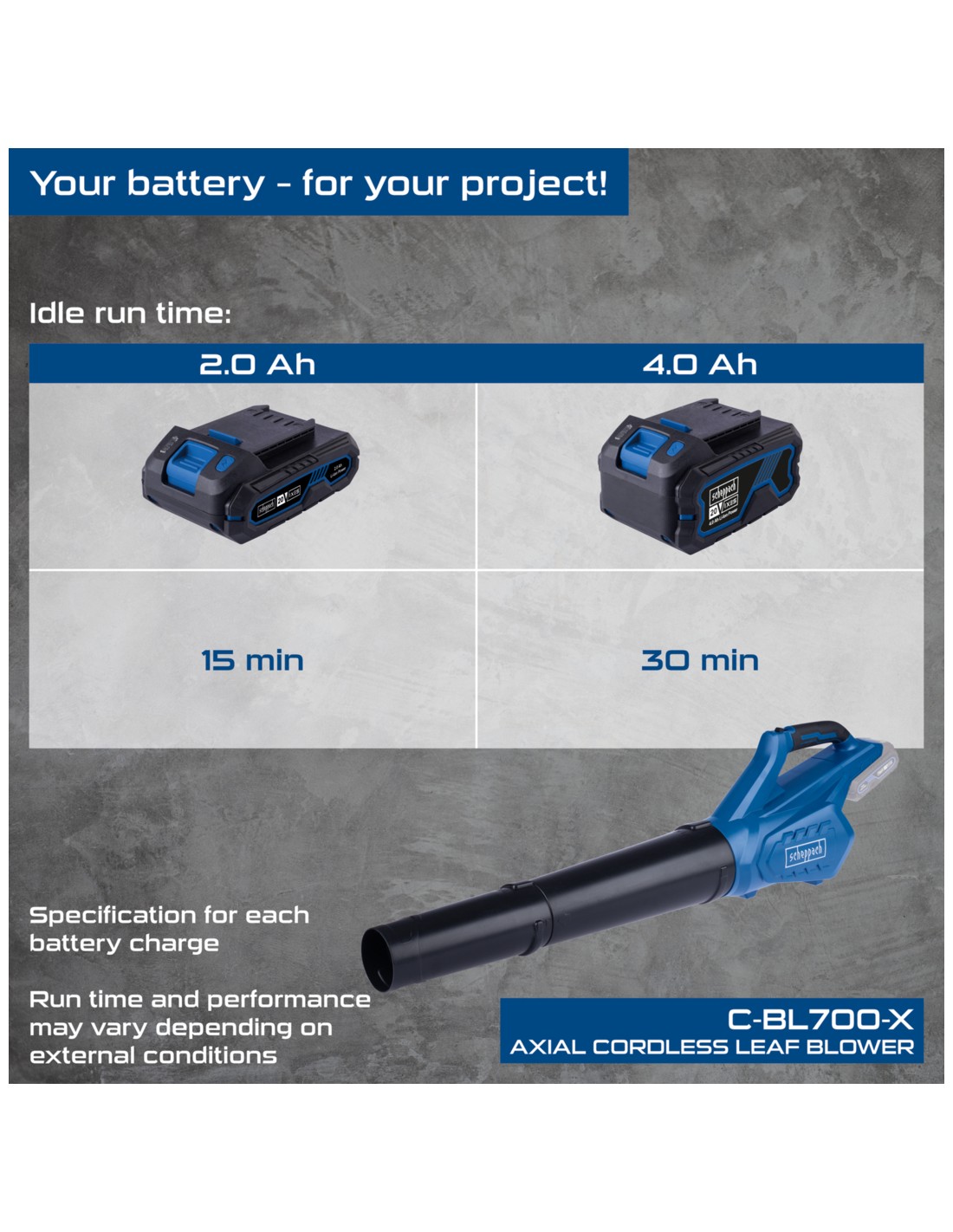 Fait partie de la série Scheppach IXES 20 volts, toutes les batteries et tous les chargeurs de la série système peuvent être combinés avec le souffleur de feuilles. Batterie et chargeur disponibles séparément.