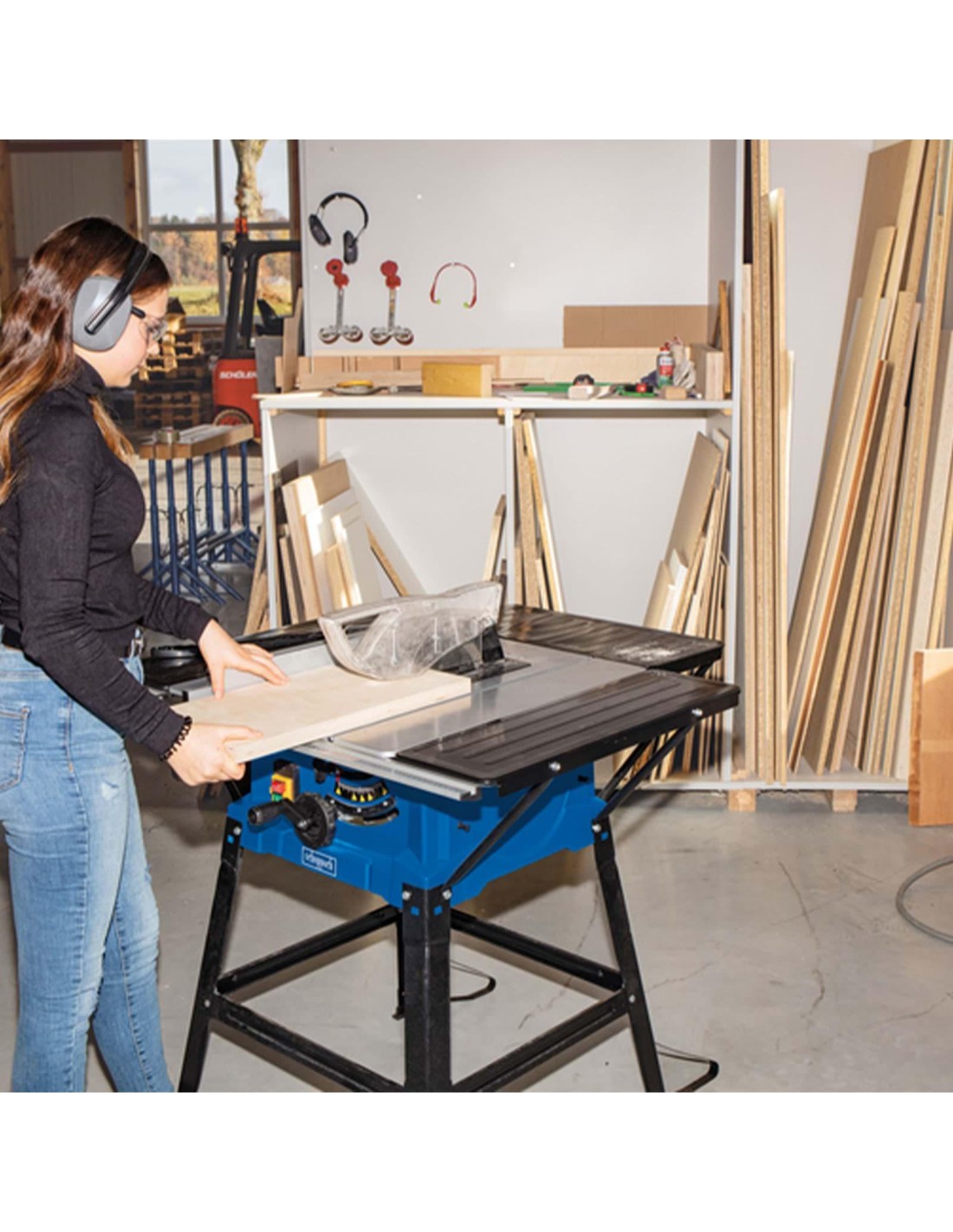 La scie à table Scheppach HS110 est montée en standard sur un châssis stable - elle dispose donc d'un support sûr et antidérapant et d'une hauteur de travail confortable de 87 cm. La scie et la base ne pèsent que 19 kg, elle peut donc être facilement installée au milieu de l'atelier ou à l'extérieur pour travailler. Cela signifie que vous disposez toujours d'une liberté de mouvement suffisante lorsque vous manipulez de longues planches.