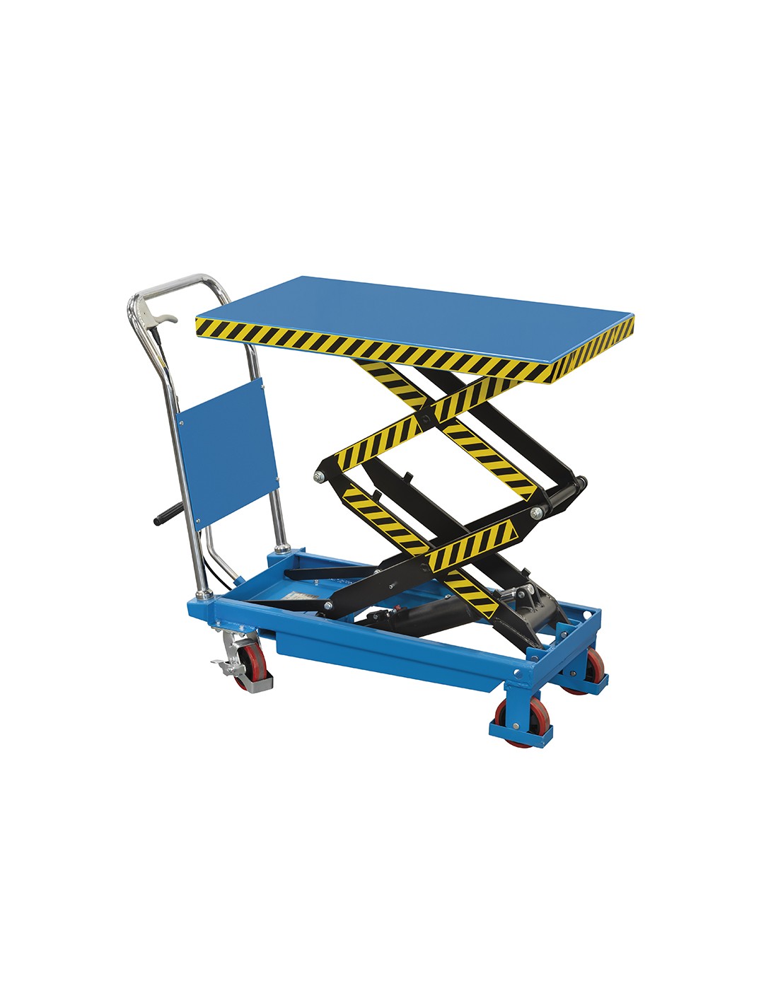 Avec double action de ciseaux, système de blocage mécanique de la plate-forme, roues pivotantes avec freins.