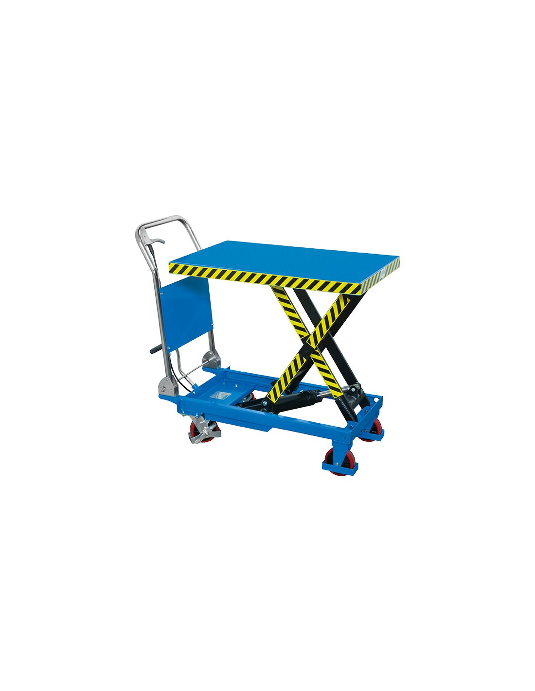 Avec poignée pliable, système de blocage mécanique de la plateforme, roues pivotantes avec freins.