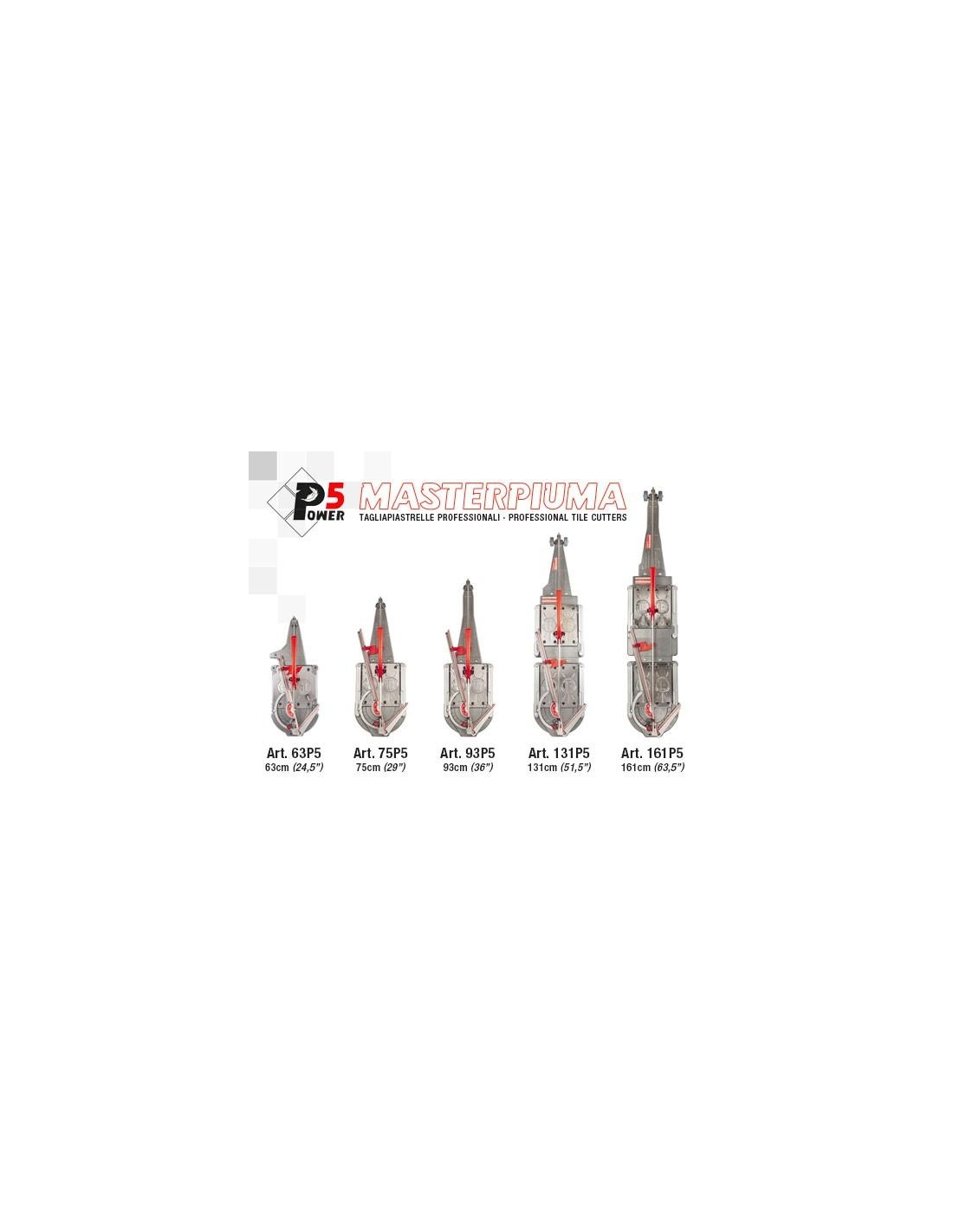 La famille de coupe-carreaux super professionnels Masterpiuma Power 5 comprend les modèles 63P5 (cm 63 × 63), 75P5 (cm75x75) et 93P5 (cm 93 × 93) dans les dimensions classiques auxquelles s'ajoutent les tout nouveaux 131P5 (cm 131 × 131 ) et 161P5 ( 161 × 161 cm) pour mieux accueillir les derniers carreaux de céramique.