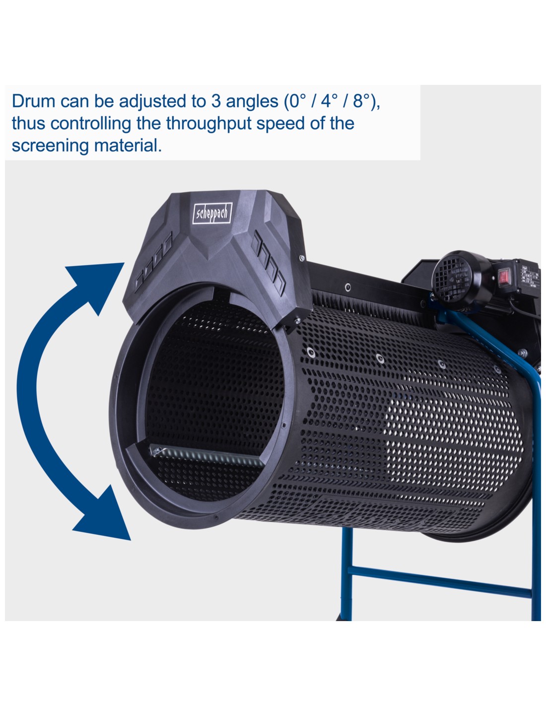 • Inclinaison du tambour réglable sur 3 angles (0° / 4° / 8°), permettant de réguler le débit des matériaux criblés