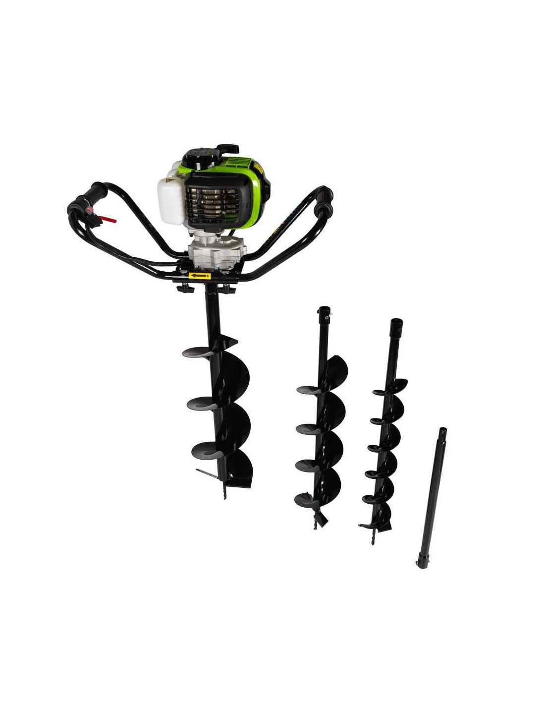 Contenu de la livraison : 3 forets (Ø100 | 150 | 200 mm) + rallonge de foret (+500 mm), clé à bougie, bol de mélange de carburant pour le mélange huile-essence.