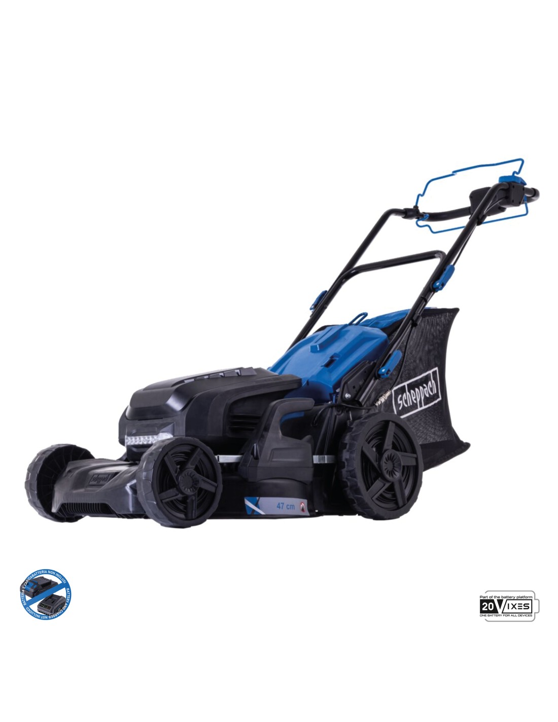 TONDEUSE À GAZON À BATTERIE 47 CM • Tondeuse à gazon sans fil haute performance avec une largeur de coupe de 47 cm, adaptée aux jardins de 800 à 900 m2 • Moteur sans balais sans entretien et particulièrement efficace, avec une autonomie et une durabilité accrues et une faible usure • Fonctionnement sans fil avec la série Scheppach IXES 20 Volts – toutes les batteries et chargeurs de cette série de systèmes peuvent être combinés avec la tondeuse à gazon sans fil • Puissant 2x 20 V pour le fonctionnement et l'extension de la batterie pour 2 batteries supplémentaires • Réglage centralisé de la hauteur de coupe • Poignée ergonomique qui absorbe les vibrations • Entraînement Vario – la propulsion arrière avec vitesse réglable de 2,5 à 4,5 km/h facilite la tonte sur terrain accidenté • Grand bac de récupération de 75 L avec indicateur de niveau de remplissage • Phares LED permettant de travailler au crépuscule ou dans des conditions de faible luminosité • Boîtier en acier robuste avec poignée de transport intégrée pour un transport facile • Compartiment à batterie avec capuchon de protection rabattable • Lame polie en acier spécial - particulièrement robuste et durable - Roues hautes - les grandes roues ménagent le la pelouse assure un maintien sûr même sur des terrains escarpés - Poignée avant pliable et réglable en hauteur pour un rangement peu encombrant et une position de travail ergonomique - Éjection intégrée sur le côté et à l'arrière ainsi que fonction mulching pour un résultat professionnel - Batterie et chargeur disponibles séparément