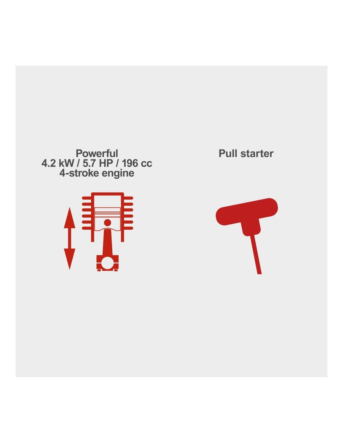 - Puissant moteur thermique à 4 temps de 5,7 CV, 4,2 kW et 196 cm3