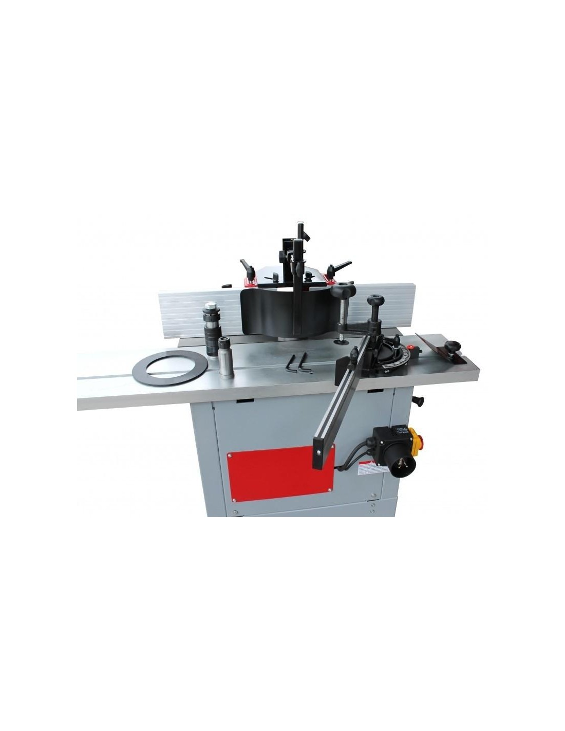 Livrée avec le capot complet de protection de la toupie + guides, l' arbre échangeable (D. 12mm), un guide d'onglet, une pince de serrage, le presseur, les bagues de serrage et remplissage.