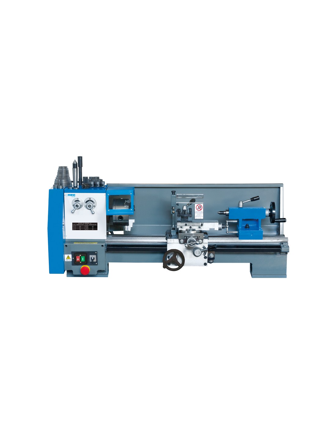 Avec changement de vitesse par engrenages, roulements de broche coniques morse, panneaux réglables, capot à vis mère, protection de mandrin avec micro-interrupteur.