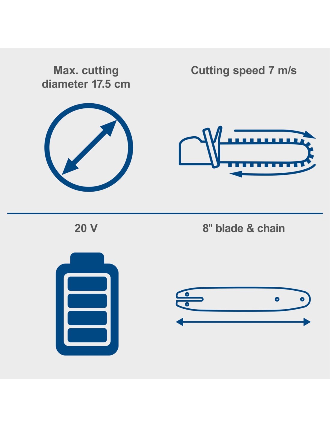 SCIE ARBO SANS FIL 20 CM • Scie arboricole sans fil puissante pour la coupe du bois de chauffage, la taille des arbustes, les bordures ou l'entretien du jardin • Moteur sans balais sans entretien (moteur brushless) avec un rendement particulièrement élevé, une autonomie plus longue, une longue durée de vie et une faible usure • Fonctionnement sans fil avec la série Scheppach IXES 20 volts – toutes les batteries et chargeurs de la série système peuvent être combinés avec la tronçonneuse sans fil • Vitesse de coupe de 7 m/s pour une progression de coupe rapide - Haute qualité 8" / Guide-chaîne et chaîne ProCut de 20 cm et longueur de coupe de 17,5 cm - Changement de chaîne et tension de chaîne sans outil - Poignée circonférentielle avec poignée souple pour un travail ergonomique et des applications polyvalentes - Le frein de chaîne anti-rebond arrête la chaîne en quelques millisecondes en cas de rebond - Une butée à griffes en métal robuste protège le matériau du glissement - Lubrification automatique de la chaîne - Batterie et chargeur séparément *Cette tronçonneuse est uniquement destinée aux utilisateurs formés à l'entretien des arbres