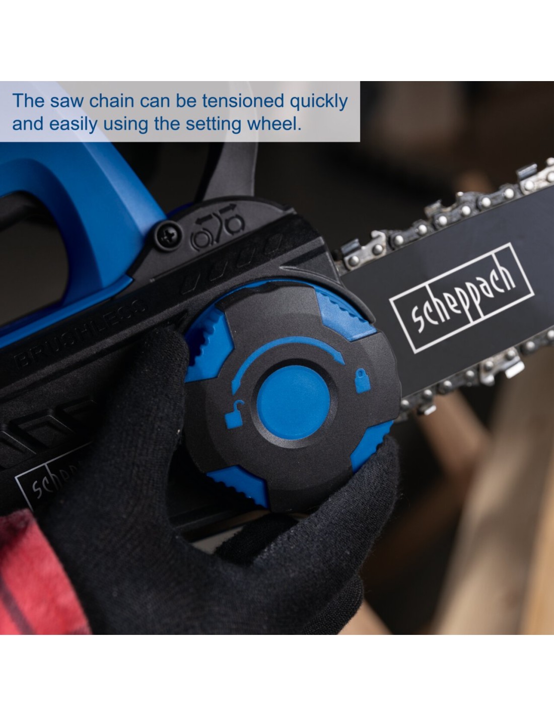 SCIE À BÂTON SANS FIL 20 CM • Scie d'arboriste sans fil puissante pour la coupe du bois de chauffage, la taille des arbustes, les clôtures ou l'entretien du jardin • Moteur sans balais sans entretien (moteur sans balais) avec un rendement particulièrement élevé, une durée de fonctionnement plus longue, une longue durée de vie et une faible usure • Travail sur batterie avec la série Scheppach IXES 20 volts - toutes les batteries et tous les chargeurs de la série système peuvent être combinés avec la tronçonneuse sans fil • Vitesse de coupe de 7 m/s pour une coupe rapide - Guide-chaîne et chaîne ProCut de haute qualité de 20 cm (8") et d'une longueur de coupe de 17,5 cm - Changement et tension de chaîne sans outil - Poignée périphérique avec revêtement Softgrip pour un travail ergonomique et des applications polyvalentes - Le frein de chaîne anti-rebond arrête la chaîne en quelques millisecondes en cas de rebond - Le protège-griffes métallique robuste protège le matériau contre les glissements - Lubrification automatique de la chaîne
