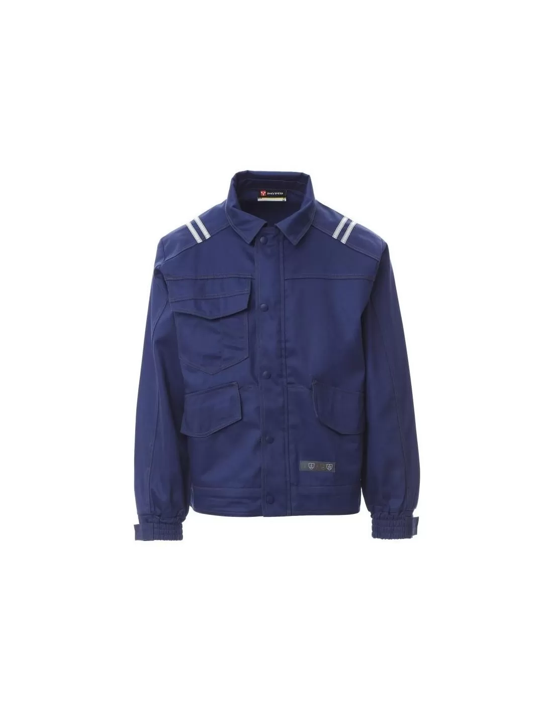 Blouson de type jeans en coton antistatique, antiacide, ignifuge, résistant aux arcs électriques et adapté aux soudeurs, doubles coutures en contraste, renforcées sur les manches, les côtés et le dos. Deux grandes poches à la taille et une petite poche sur la poitrine à droite avec porte-stylo, toutes couvertes par un rabat fermé par un velcro. Bas de dos profilé pour une meilleure couverture et réglable par velcro, manches montées avec poignet élastique doté d'attaches de brandebourg avec velcro pour réglage ultérieur. Zip avant couverte par un rabat à bouton-pression. Bandes 3M rétroréfléchissantes appliquées sur les épaules et le bas du dos. Porte-badge en plastique détachable.